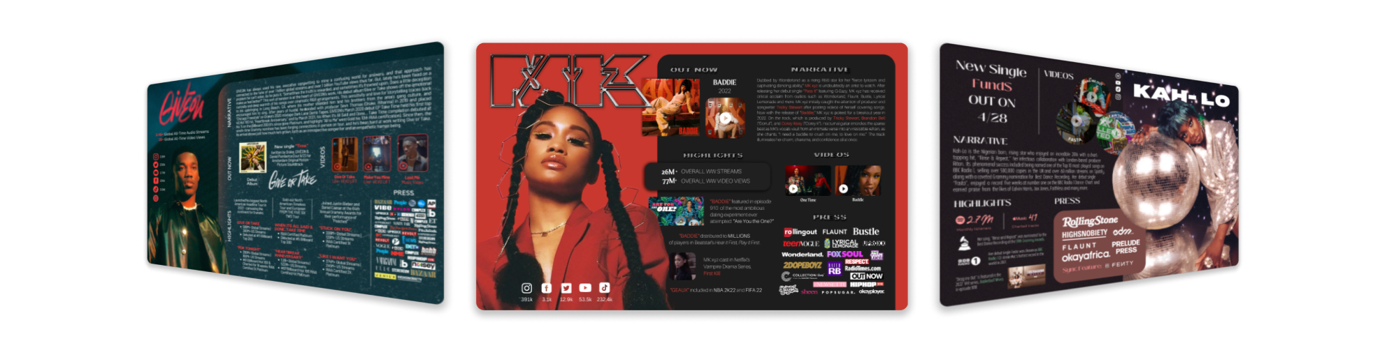 Concise, visually appealing one pager that highlights key information about an artist, including their bio, music, achievements, and branding. Serves as a promotional tool for partnerships, showcasing artists’ identity and impact at a glance.